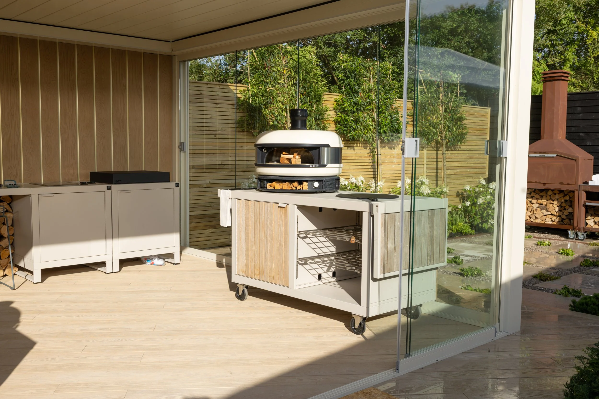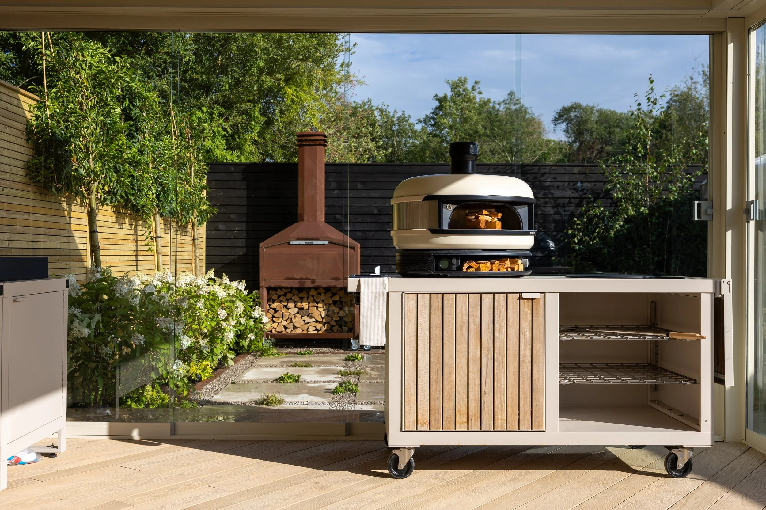 Equipped with high-quality appliances such as the Gozney pizza oven and durable materials such as Dekton worktops, an outdoor kitchen allows you to host your family and friends for years to come. It reflects a luxurious approach to outdoor cooking, blending seamlessly with the modern garden aesthetic.